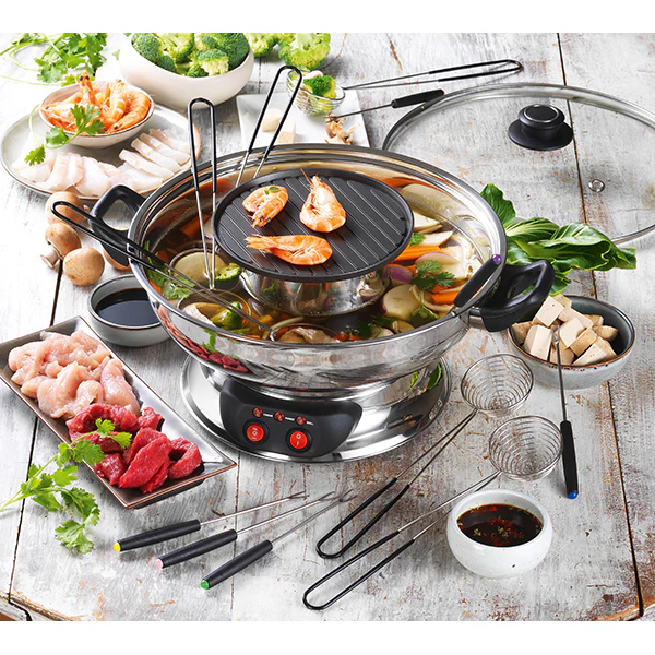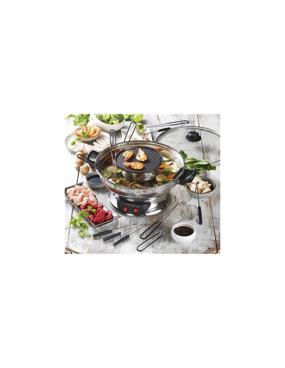 L’appareil se place en centre de table et accueille votre bouillon qu’il maintien au chaud grâce à sa puissance de 1350 W. De plus, au milieu de l’appareil, vous pouvez griller quelques aliments sur la plaque de cuisson de 650 W.
