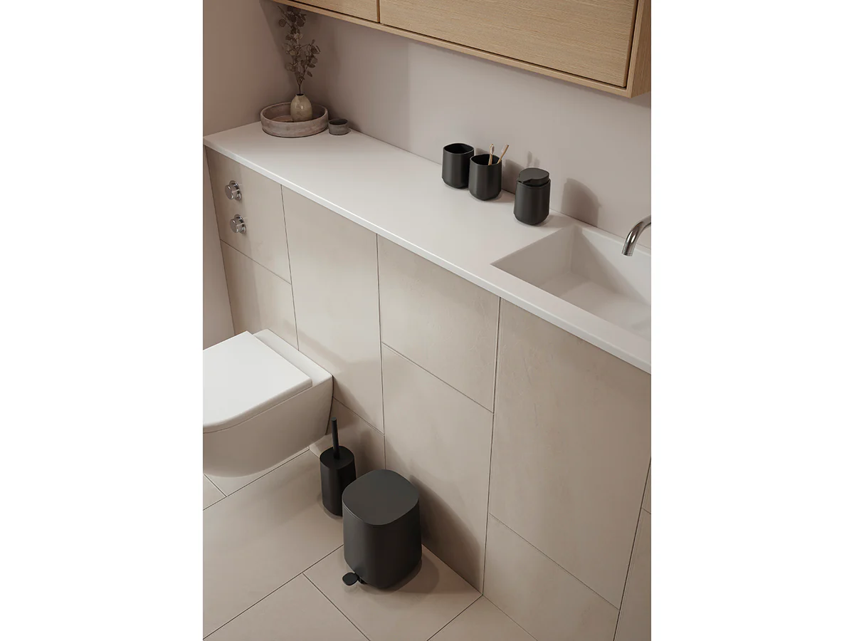 La série de salle de bain TIME attire incontestablement le regard. Trois des quatre produits de la série, à savoir le distributeur de savon, le gobelet de brosse à dents et la brosse de toilette, sont en béton avec quelques détails en plastique. En revanche, la poubelle à pédale est en plastique ABS pur, mais est assortie aux produits en béton en termes de couleur, de sorte que la série apparaît comme un ensemble. Le béton est connu pour son charisme et sa naturalité sans compromis et est de plus en plus en vogue depuis quelques années. Il est à la fois dur, doux et très beau. De plus, il s’agit d’un matériau un peu plus économe en énergie que la céramique, par exemple, car il n’a pas besoin d’être cuit à haute température.