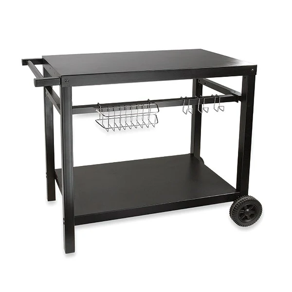 Le chariot pour plancha en métal vous servira à entreposer votre plancha en extérieur. Ce chariot convient pour des planchas allant de 2 à 4 brûleurs. En métal avec la finition noire, il résiste aux intempéries et ne rouille pas ! Cette desserte pour plancha est extrêmement pratique: elle dispose d’une étagère pour poser des accessoires ou autres objets (boissons, aliments, ustensiles…), mais aussi d’un bac en inox et de 3 crochets pour suspendre votre pince, raclette, spatule etc.