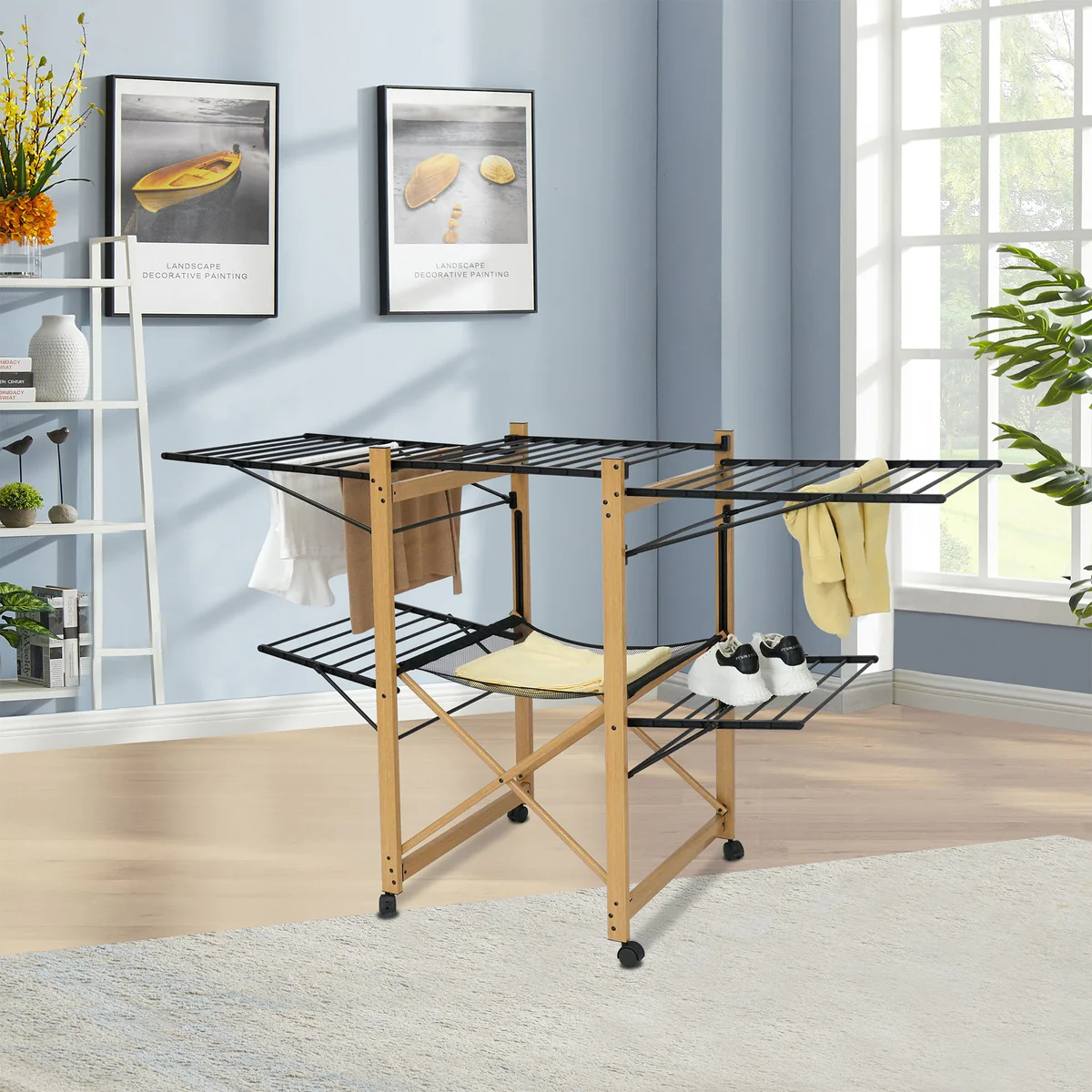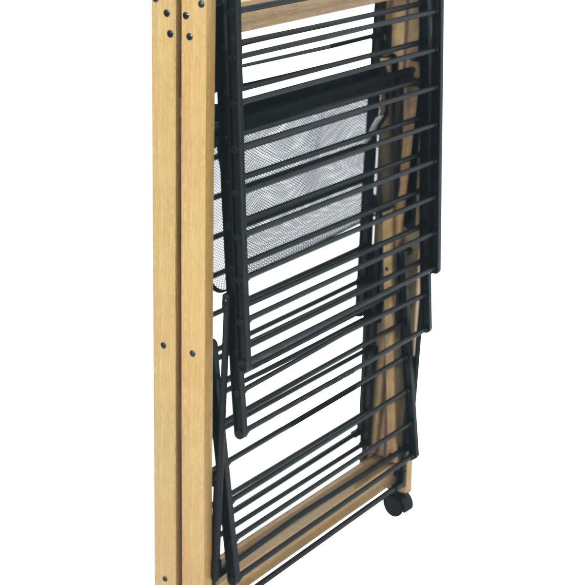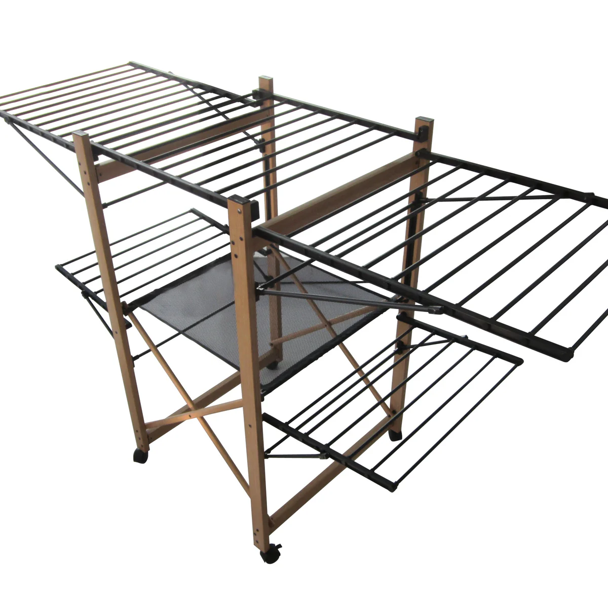 - Étendoir à linge design en acier imitation bois, de grande capacité, extensible et pliable pour un séchage rapide. Couleur noir et bois.
