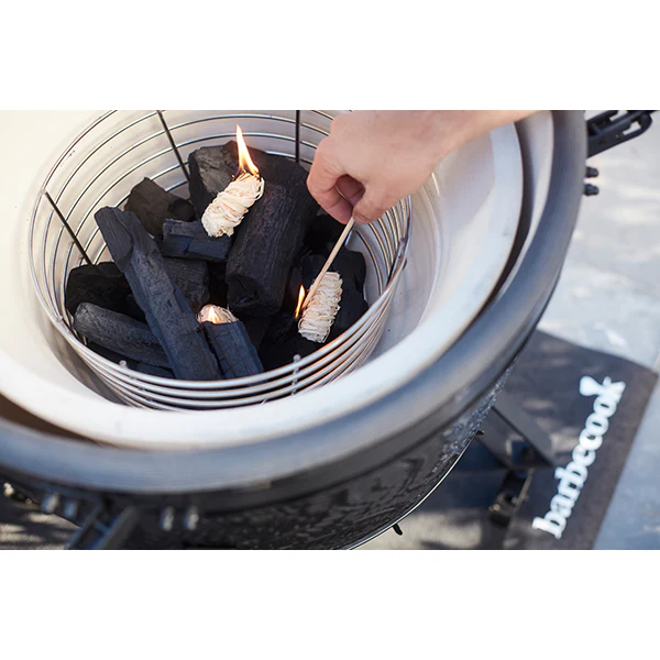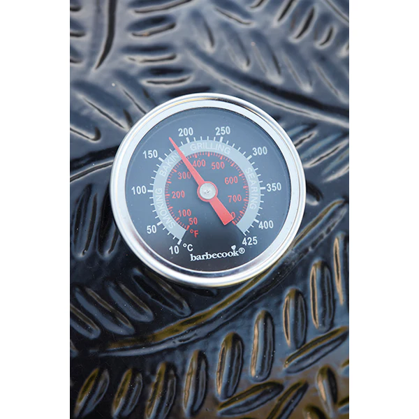 Le Kamal 60 de Barbecook se compose d’une soupape supérieure en fonte d’aluminium, d’une cuve à charbon de bois et d’un bac de collecte de cendres en acier inoxydable ainsi que d’un couvercle avec arrivée d’air réglable et thermomètre intégré pour surveiller la cuisson.