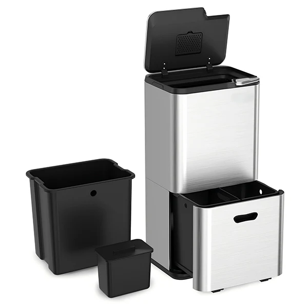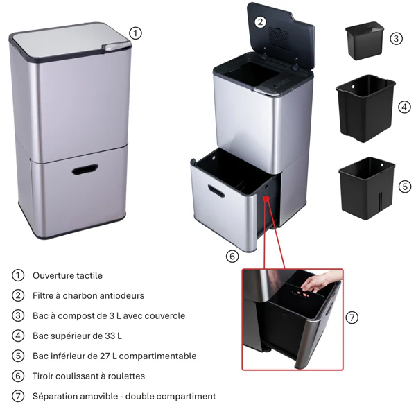 La poubelle de tri sélectif offre une capacité totale de 63 L répartie en trois bacs : un bac supérieur de 33 L, un bac inférieur de 27 L doté d’une séparation amovible pour moduler vos besoins, et un bac à compost de 3 L équipé d’un couvercle. Son tiroir inférieur monté sur roulettes assure un accès fluide et confortable. Conçue en acier inoxydable à finition satinée avec des bacs intérieurs en polypropylène, elle allie durabilité et facilité d’entretien. Un filtre à charbon antiodeurs intégré sous le couvercle maintient un environnement sain et frais.