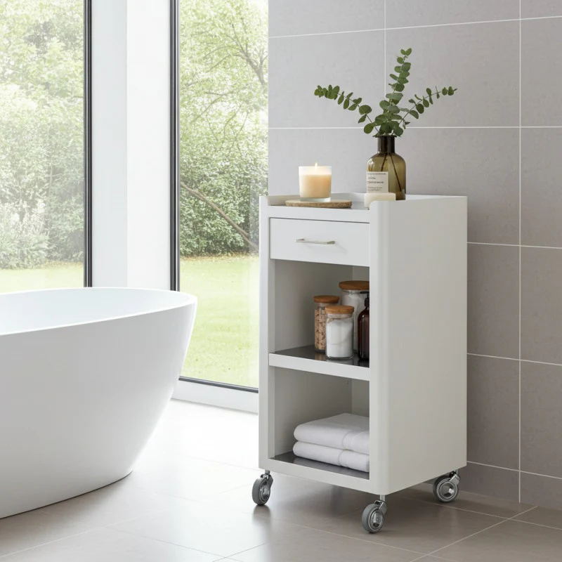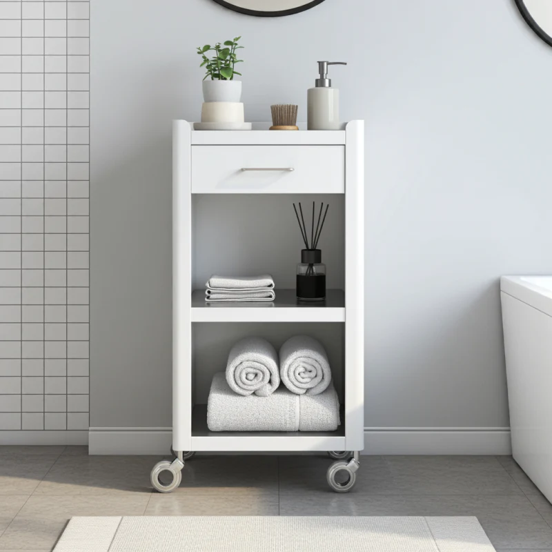 Soyez le premier à laisser votre avis sur “Meuble rangement salle de bain, cuisine, bureau. étagère avec tiroir. style scandinave, 42 x 31 x 82 cm., blanc-inox, thelma Don Hierro”
