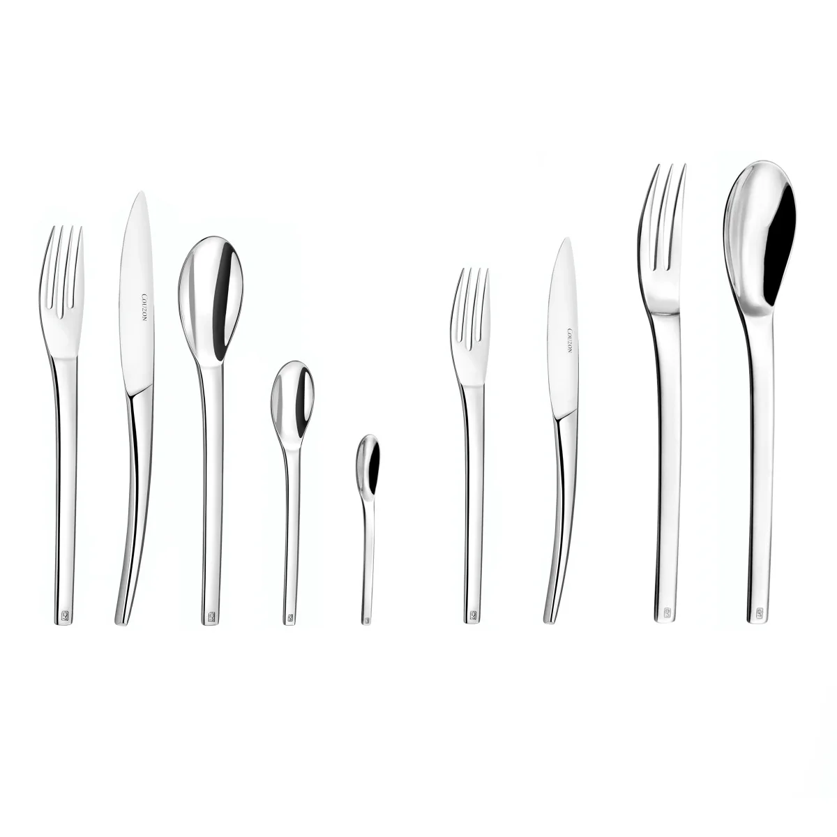 Ensemble de 86 couverts de la gamme Neuvième Art livré en coffre bois. Acier inox 18/10 et finition poli-miroir.
